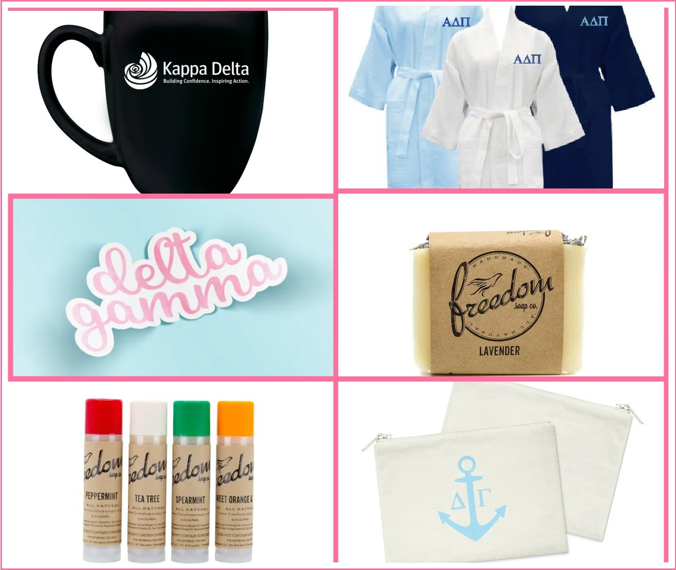 Choose your sorority bathrobe, fabulous soap, lip balm, amazing coffee/tea cup and a great sticker to go anywhere! Make sure you choose your lip balm flavor and soap scent. Mugs come in several colors too.